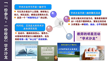 在沙龙上每位教师都能够表达自己的见识,从而与大家分享,大家也是在这样的交汇和比较过程中互相学习,建构自身的认知体系。这是一个“时渐而化之”的过程,需要有耐心,需要能够参与、融入,需要成为其中的主动的一员,这样你的收获就会非常大。等待,观望,冷漠,封闭,都无助于你的进步。